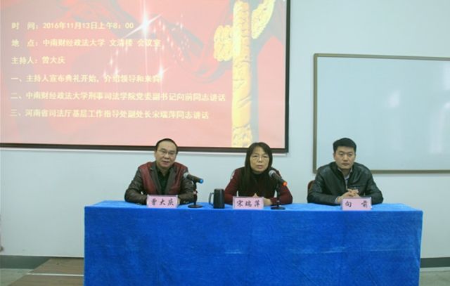 11月13日上午,河南省第四期社区矫正管理干部培训班在文清楼四楼会议室隆重开班。出席典礼的嘉宾有河南省司法厅基层工作指导处副处长宋瑞萍同志,我院党委副书记向前同志,培训中心主任曾大庆老师及河南省各级社区矫正司法工作者。