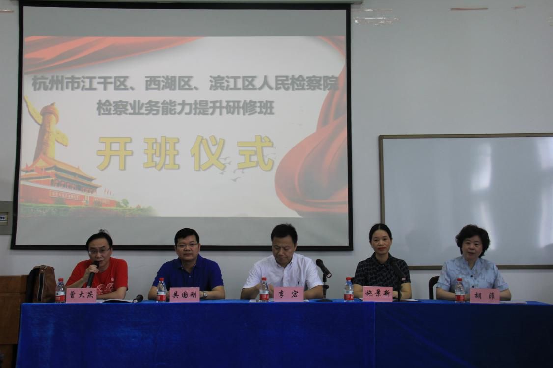 (新闻网讯 通讯员: 冯晨光 胡纪翔)5月15日上午8:00,杭州市检察系统业务能力提升研修班在文清楼411开班。我院党委书记李宏同志,杭州市江干区人民检察院党组成员,检察长江波均同志及杭州市江干区、西湖区、滨江区三院70余名检察官们出席了本次开班仪式。杭州市检察系统业务能力提升研修班分为两期,共一百五十六名学员参加。本次研修班为第一期,开班仪式由我院培训中心主任曾大庆老师主持。