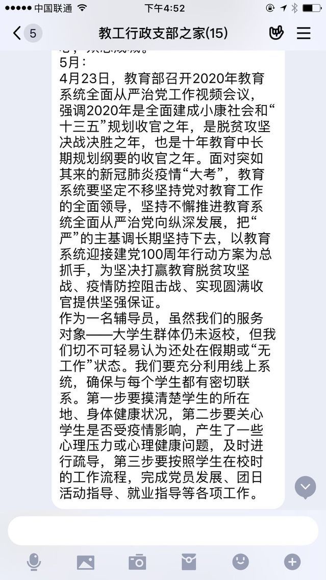 新闻网讯(通讯员王晓丹)为深入学习贯彻习近平总书记关于全面从严治党的重要论述精神,及时学习传达2020年教育系统全面从严治党工作视频会议和学校2020年全面从严治党工作会议精神,抓牢党风廉政建设,推进全面从严治党,营造风清气正、干事创业良好政治生态。2020年5月18日,亚洲色情 教工行政党支部以“深化全面从严治党,决战决胜脱贫攻坚”为主题召开党日活动,为提升学习效果,本次活动以自主学习、支部集体学习及线上讨论的形式开展,支部全体同志参与本次活动。