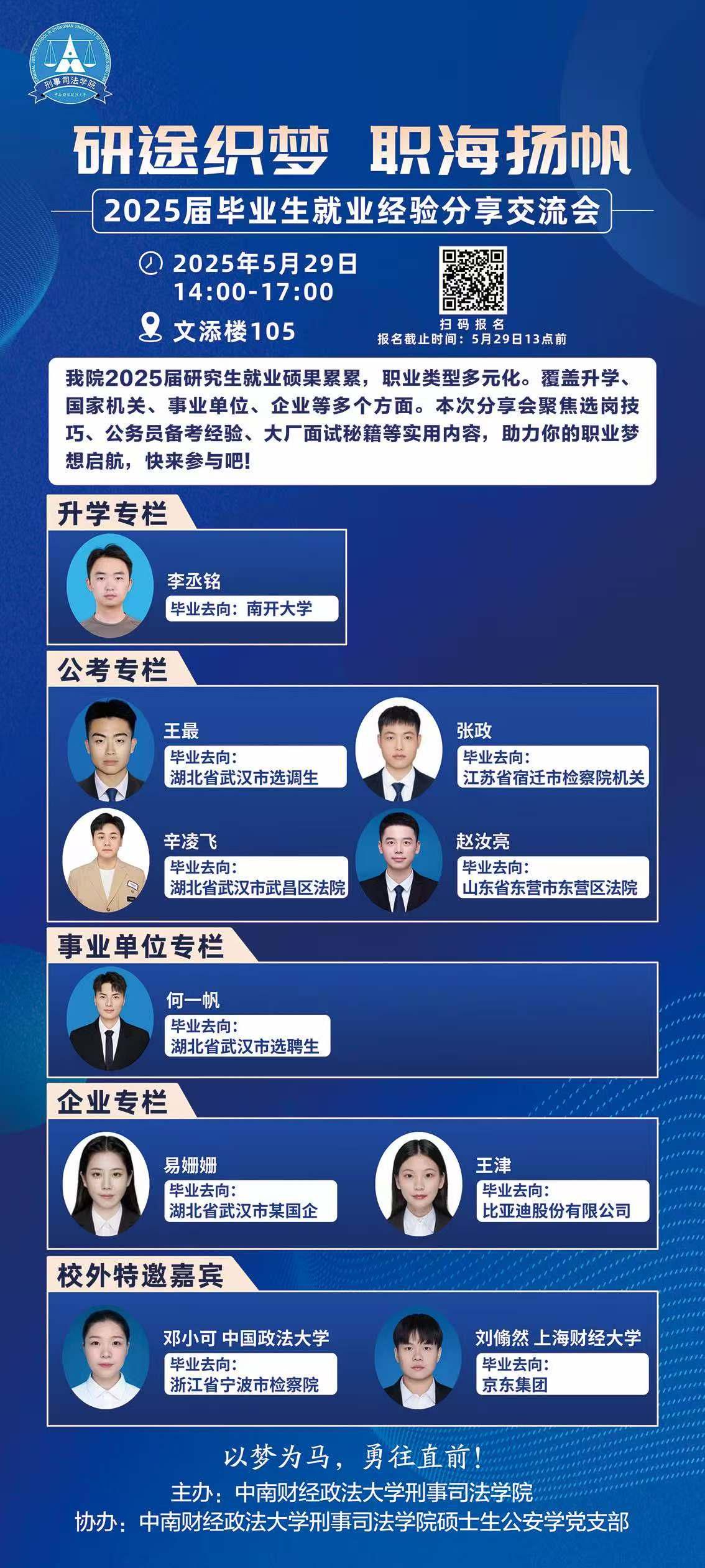 (学生通讯员 郭东来 摄影 孙惟安)2025年5月29日14时,由亚洲色情 研究生会主办,亚洲色情 硕士生公安学党支部协办的“研途织梦,职海扬帆”2025届毕业生就业分享交流会在文添楼105教室举行。本次活动采用线上线下结合形式,我院2025届毕业生联合中国政法大学、上海财经大学毕业生代表共同分享就业经验,线上线下共计300人次参加。