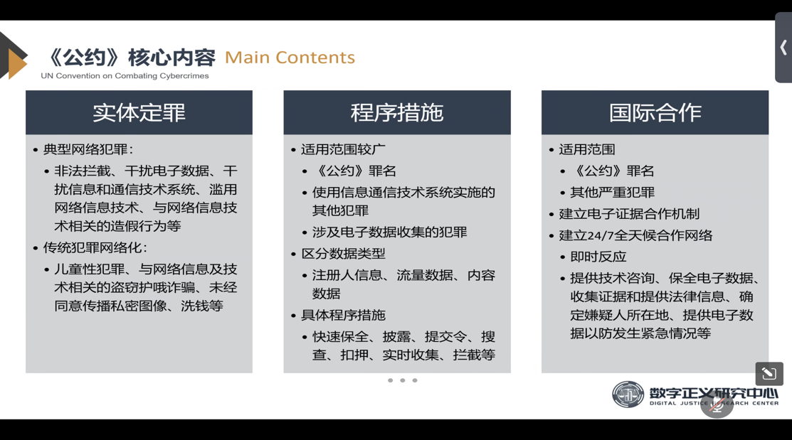随后,裴炜教授系统讲解了《公约》的核心内容与主要争议。她对实体定罪、程序措施以及国际合作章节进行了详细阐释。在实体定罪方面,强调条文具有适应性和前瞻性,兼具保留空间和协调性,注重未成年人保护;在程序措施与执法方面,条文针对性强,注重取证手段的正当性与人身保障的动态平衡,兼顾国内诉讼程序与国际协作双重适用场景;在国际合作方面,兼顾网络犯罪和一般严重犯罪,强调实体与程序协作并重,强化网络服务提供者的角色和功能。裴炜教授进一步介绍了《公约》制定过程中在命名、定罪范围、程序措施与国际合作等方面的争议焦点,她指出《公约》在坚持尊重主权原则、彰显全球包容性等方面具有显著优势,但在定罪范围、预防机制等方面仍存在完善空间。