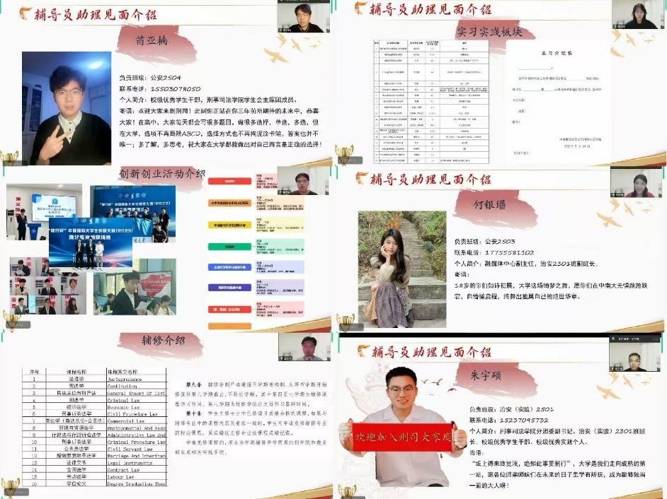 接下来,黄逸聪、何银璠、陶思媛、王泓棽、朱宇硕、苗亚楠六位辅导员助理依次与大家见面,并就创新创业活动、专业分流、实习实践、辅修学位等多个方面进行了详细的介绍与说明。