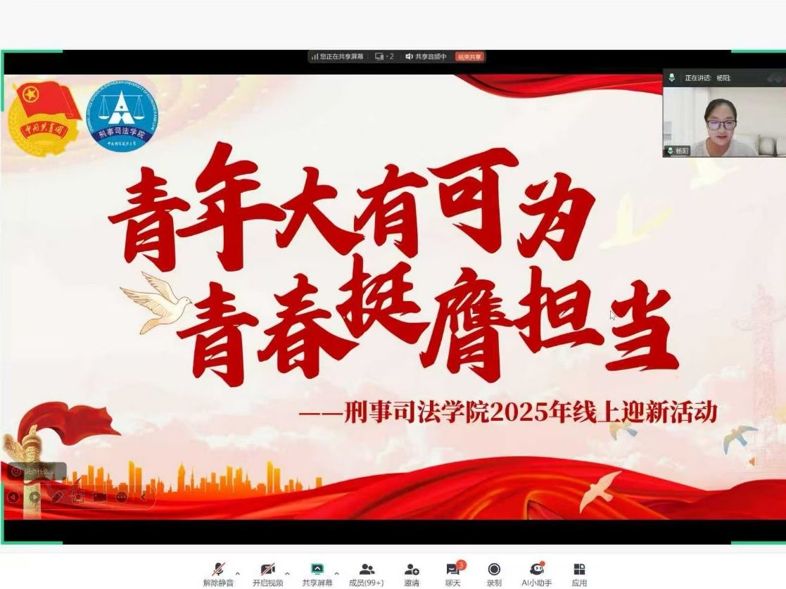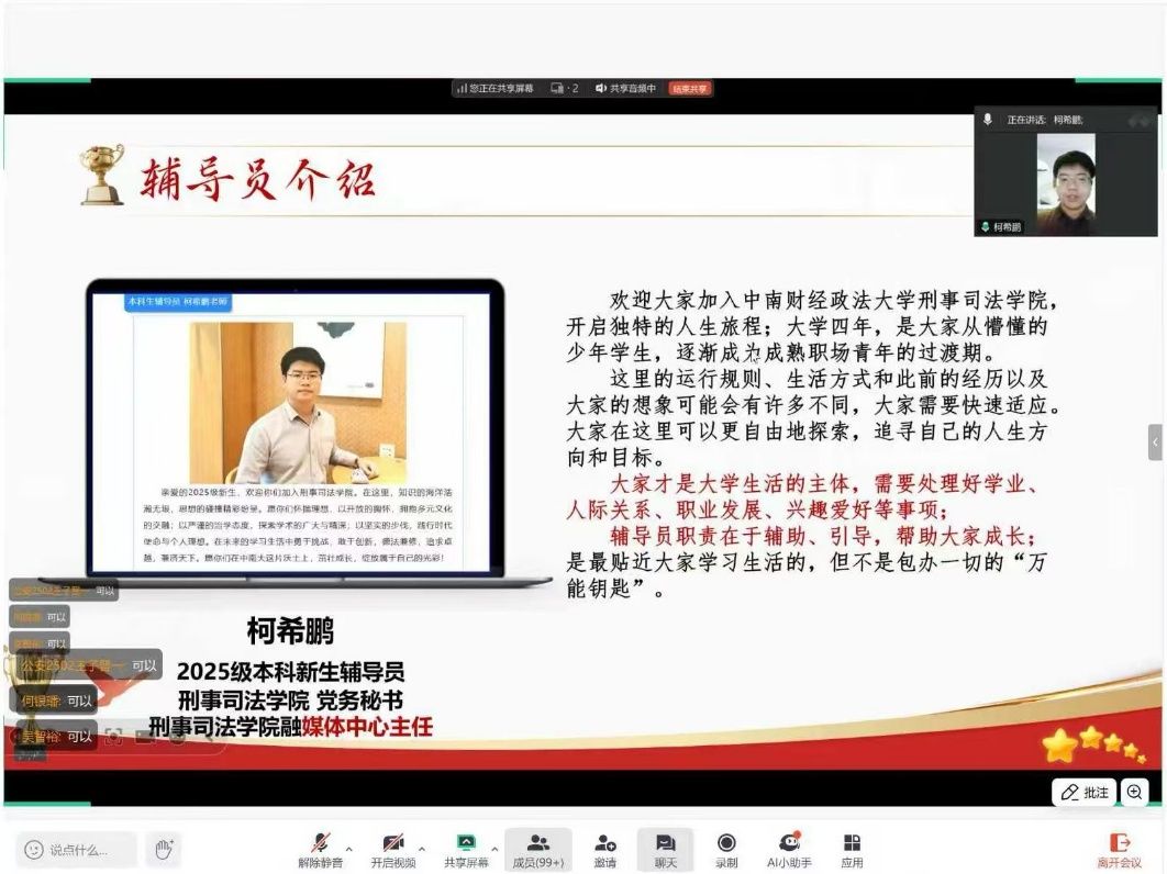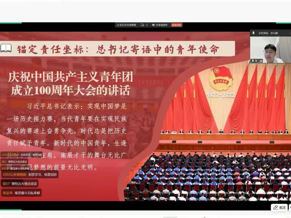 新闻网讯(学生通讯员 黄任宇菡)为弘扬二十大精神,加强理论学习,增进师生联系,促进学生与家长对学校及学院的了解,8月23日19时,亚洲色情 分团委召开“青年大有可为,青春挺膺担当” ——深入学习习近平总书记对青年的寄语精神主题云团课。亚洲色情 2025级本科生及家长参与,团课由杨阳同学主持。
