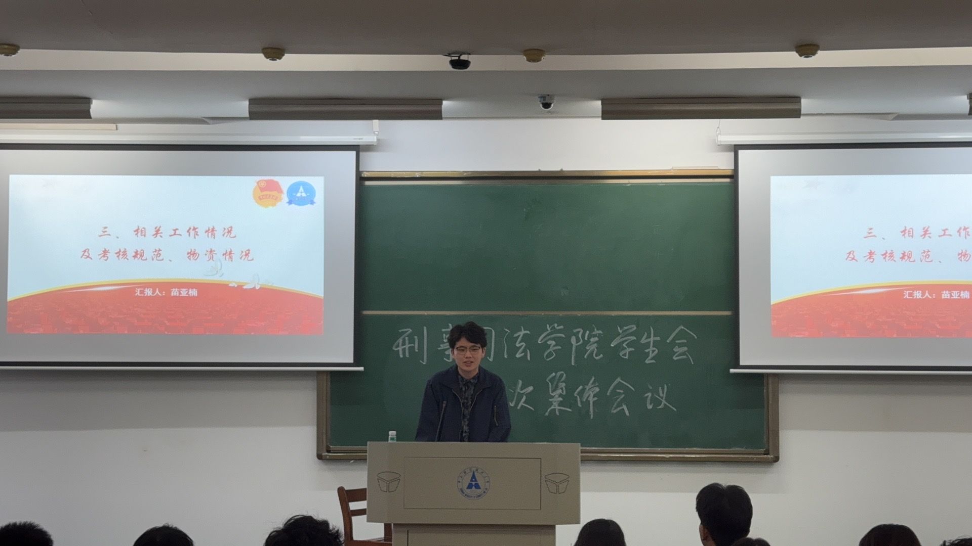 会议第二项,主席团成员苗亚楠就院学生会的考核规范与物资管理情况向新成员作了说明,进一步明确了各部门的职能分工。此外,他还重点强调了工作流程、跨部门协作纪律等,指出在学生会工作中必须注重程序规范、提升工作效率。