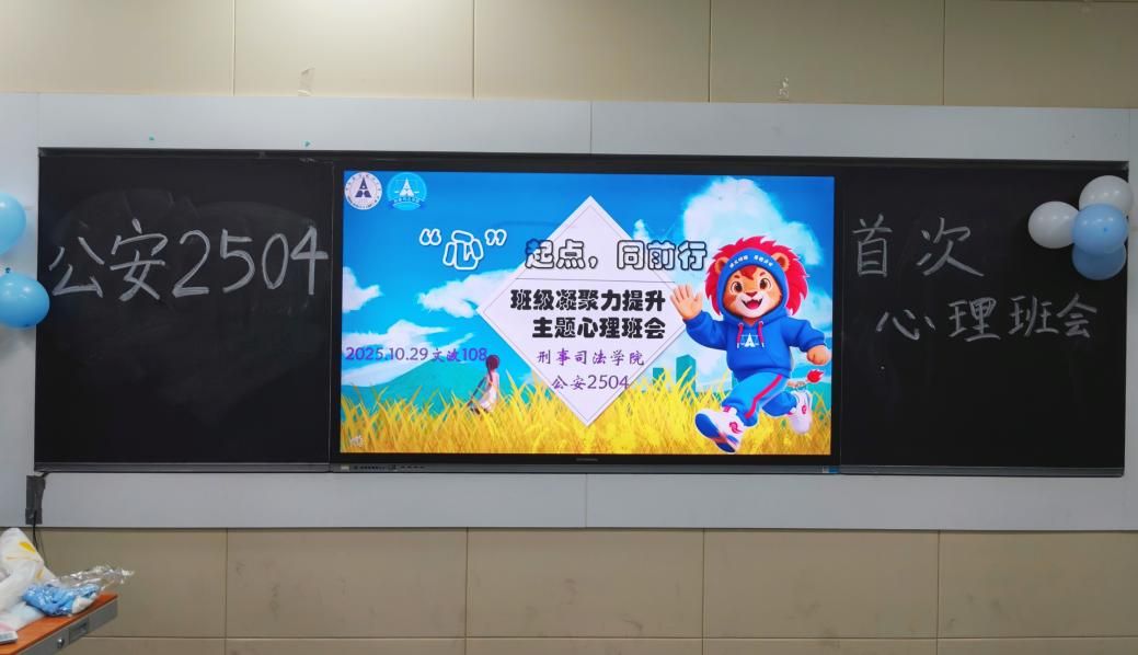 新闻网讯(学生通讯员 魏宇涵 李紫嫣 李明阳 何字颖)为有效提升班级凝聚力,帮助同学们快速融入大学集体生活,营造积极向上的班级文化氛围,10月29日,公安2504班在文波楼108智慧教室成功举办了以“‘心’起点,同前行”为主题的首次心理班会。