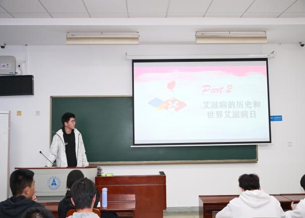 班会第一环节聚焦艾滋病基础知识与预防措施。主持人详细阐释了艾滋病的医学定义、致病机理及发展阶段,通过专业图表展示了HIV病毒攻击免疫系统的过程;同时回顾了艾滋病的发现历程与世界艾滋病日的设立背景,展现了全球共同抗击艾滋病的努力,让同学们深化了对科学防治与人文关怀理念的理解。