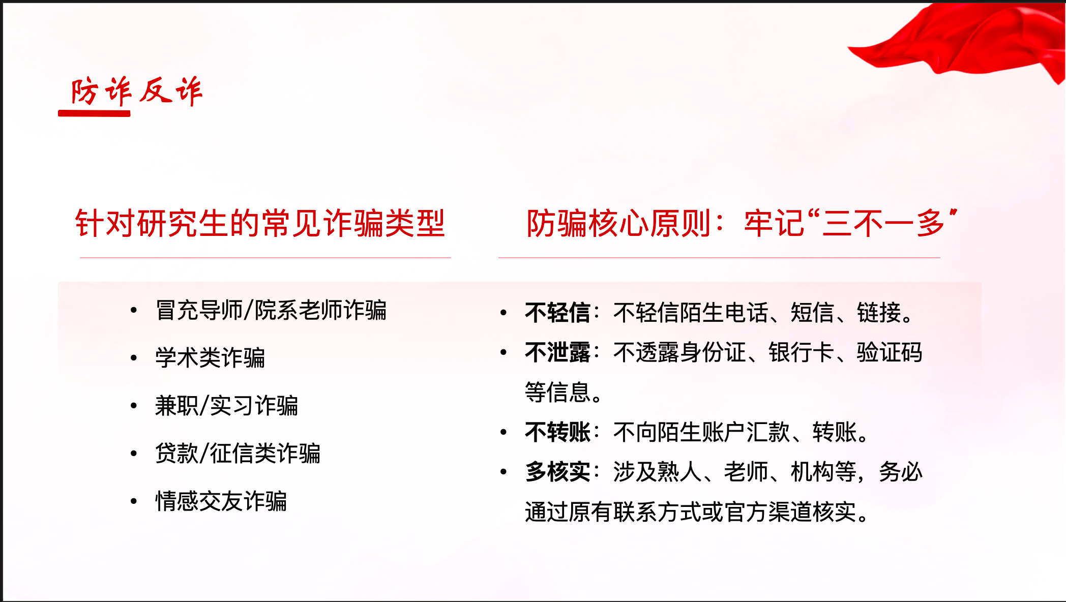 会议伊始,王晓丹结合近期案例,聚焦研究生群体易遭遇的诈骗类型,重点揭示了冒充师长指令、学术名义欺诈、虚假实习兼职等典型诈骗陷阱,提醒全体研究生时刻保持警惕。围绕反诈防骗方法,她着重强调了“三不一多”原则,即不轻信来路不明的电话与信息、不泄露个人身份及账户验证码等敏感信息、不向陌生账户转账,遇事多通过官方渠道或当事人核实。